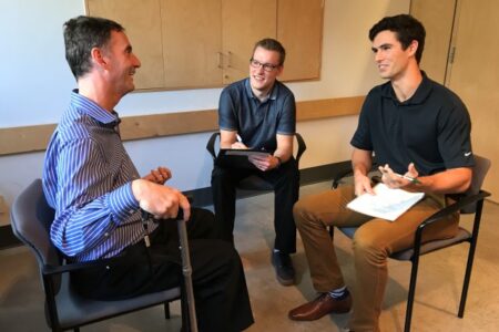 Patient partners help 1st year physical therapy students practice their patient interviewing skills.